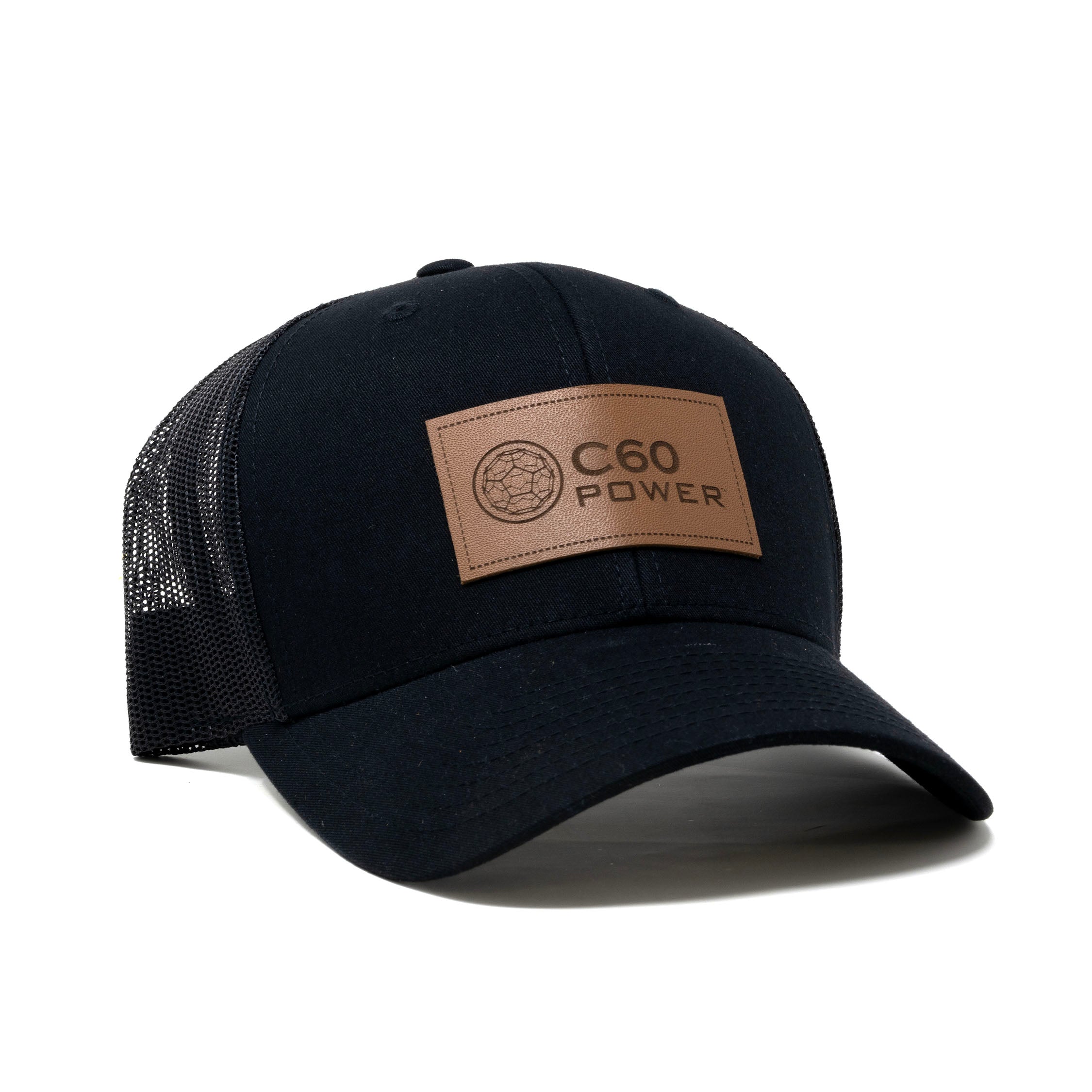 Stylish black trucker hat with a laser engraved C60 Power patch. Features a breathable mesh back and adjustable snap closure for a perfect fit.