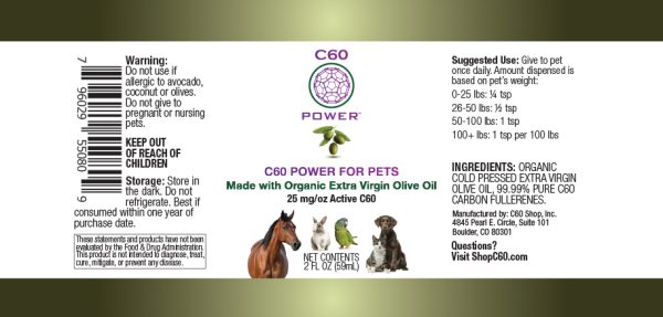 C60 Power’s C60 in Organic Extra Virgin Olive Oil for pets is made with 100% certified organic oils and 99.99% pure sublimated C60 (never exposed to solvents) with maximum concentration. C60 Power is professionally formulated and tested for purity, quality, concentration, and maximum bioavailability and made in the USA.