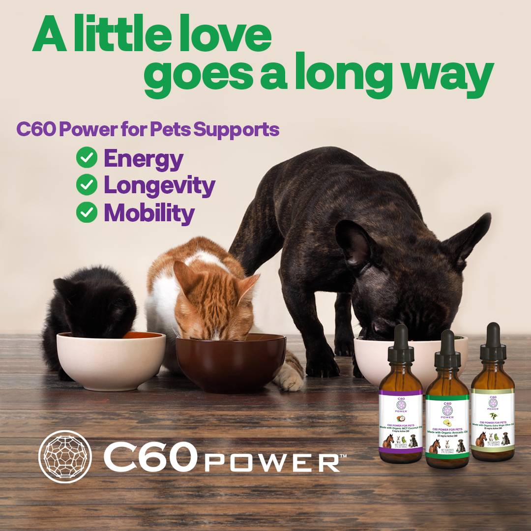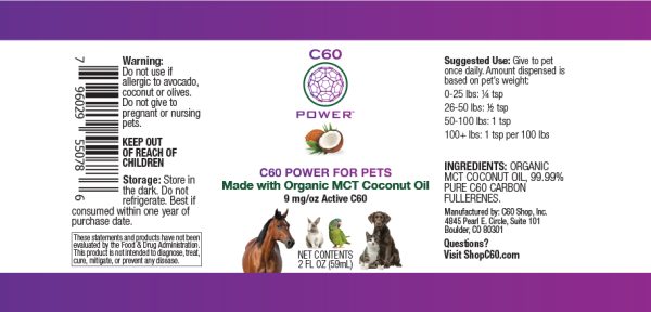 C60 Power’s C60 in Organic MCT Coconut Oil for pets is made with 100% certified organic oils and 99.99% pure sublimated C60 (never exposed to solvents) with maximum concentration. C60 Power is professionally formulated and tested for purity, quality, concentration, and maximum bioavailability and made in the USA.