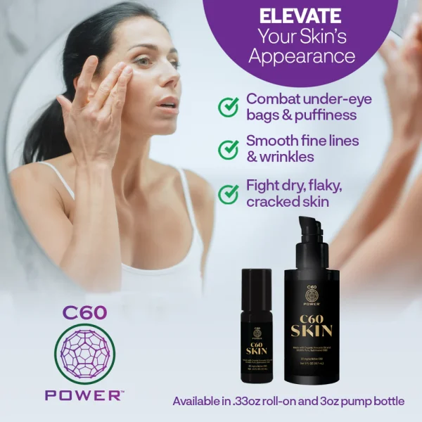 Experience the age-defying, antioxidant protection of C60 Skin, now in a convenient, roll-on bottle. Hands-free and mess-free, you can easily apply C60 Skin to your face, hands, arms, legs, or body, to lessen the appearance of fine lines and wrinkles. C60 Skin may promote skin healing, may ease discomfort associated with an allergic response, and may lessen the appearance of scarring. This lightweight and non-greasy oil may be applied topically on bug bites, on troublesome areas of skin to promote wound healing, and may also be applied to flaky or itchy patches of skin. Roll on your face, hands, or body as needed.