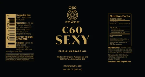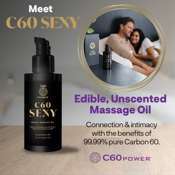 C60 Sexy is an unscented, edible massage oil made with 100% certified organic avocado oil and 99.99% pure, sublimated Carbon 60 (never exposed to solvents). Our convenient, 3 oz pump bottle makes generous application easy so you can enjoy relaxing massages, deeper intimacy, and lasting connection with your partner.